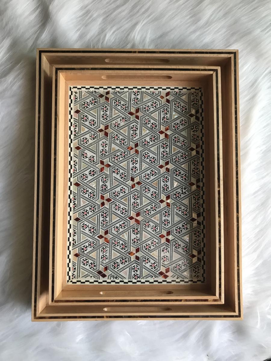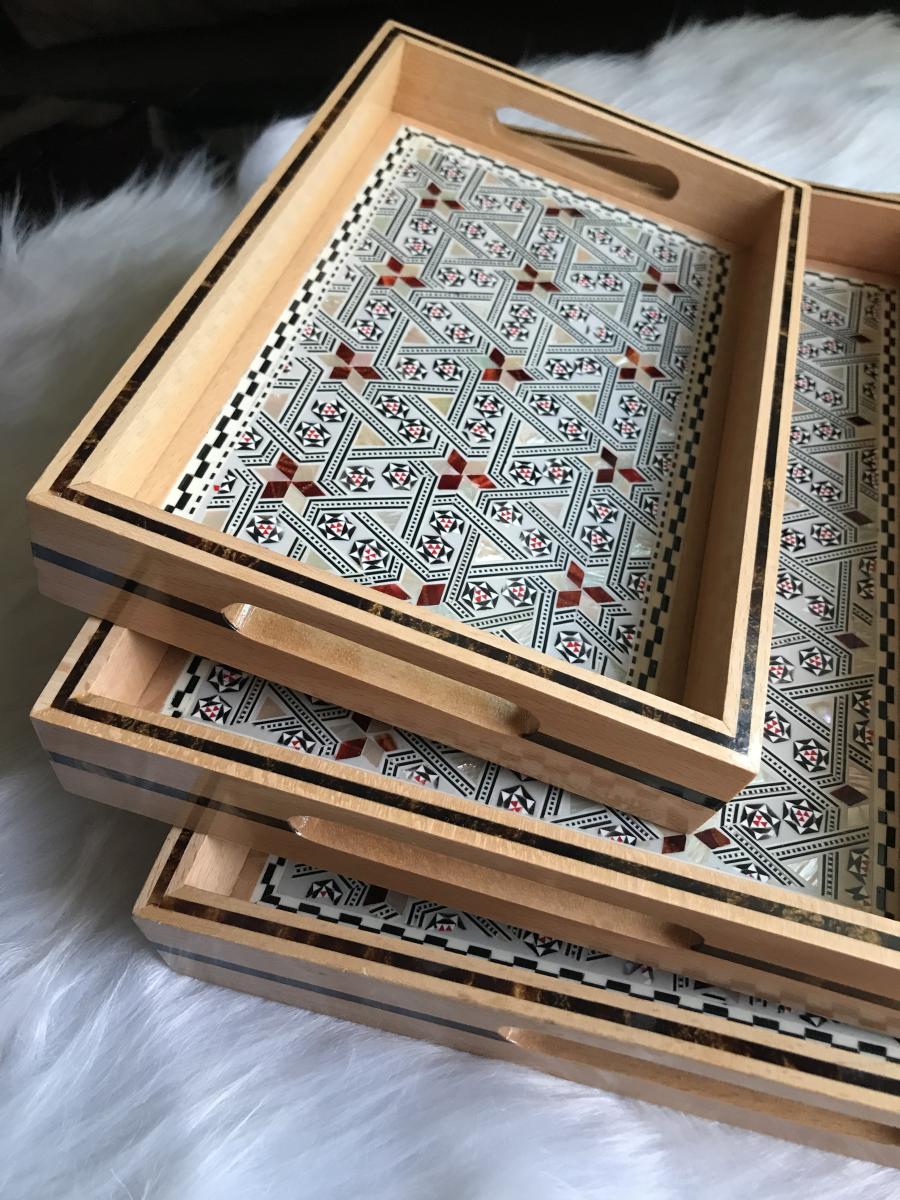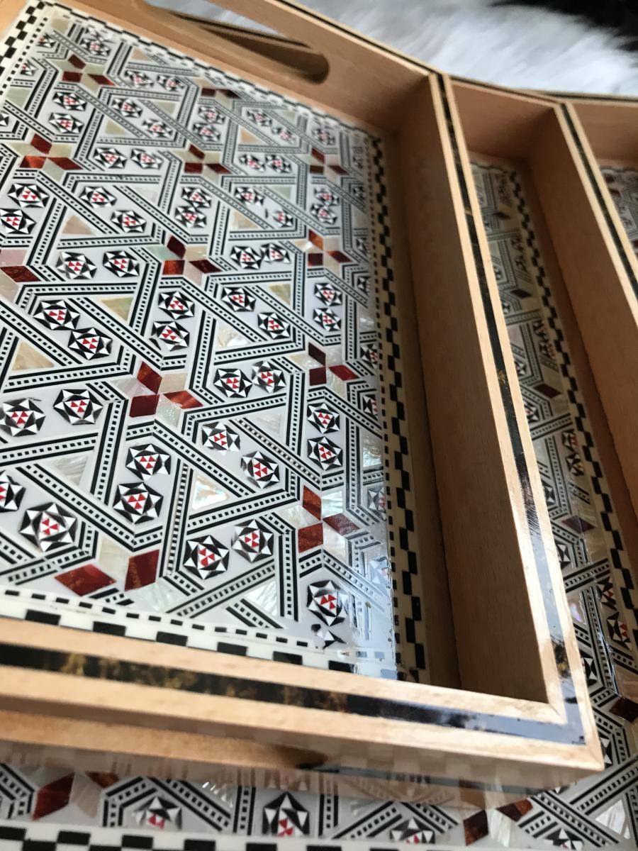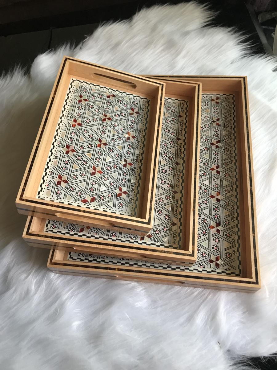 Elegance starts with the source. These trays are made of genuine red and white mother of pearl. Each piece of meticulously carved mother of pearl is place by hand on the beautiful and enduring beech wood. That is why you should not be surprised by the staring eyes as soon as you start serving in your next gathering, event, housewarming, or birthday. Of course every crowd is unique to itself. Surgegifting takes care of this aspect by providing different sizes for different crowds. So….No worries! Whether it is a solo self-care day or a heart-warming crowd accompanying your happiness we got you covered with the three sizes 😉